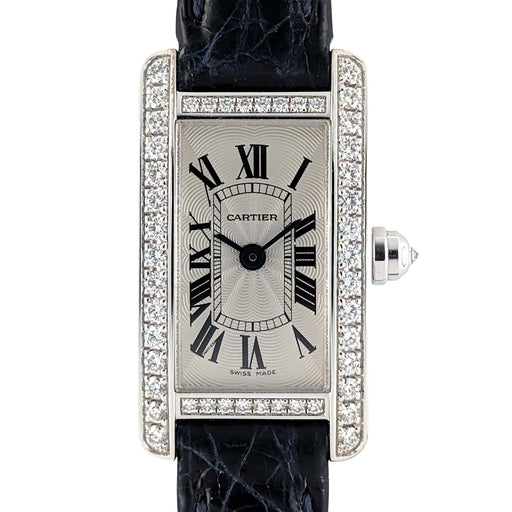 Cartier RARE Mini Tank Américaine en or blanc, lunette pavée de 47 diamants, cadran guilloché flinqué, boucle en or blanc 18 carats, boîte incluse