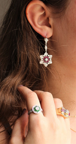 Paire de pendants d'oreilles pour oreilles percées, motifs étoilés à 6 branches, en or gris 750/1000e (18k) sertis de petits diamants taille brillant et de rubis calibrés, de style Art Déco