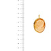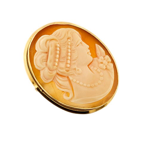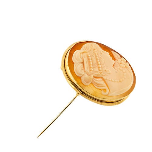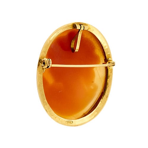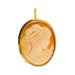 Broche pendentif ovale en or jaune 18 carats avec camée représentant une femme de profil avec collier et cheveux attachés en arrière.