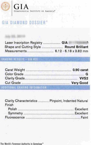 - Diamant taille brillant de 0,90 CT (certificat GIA).
