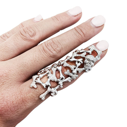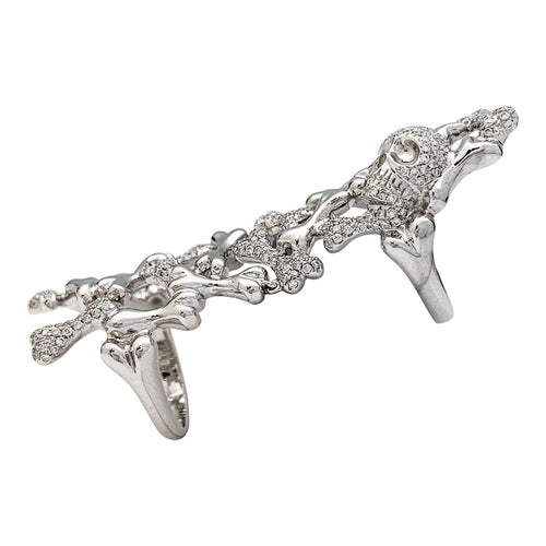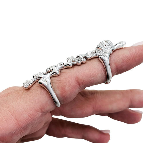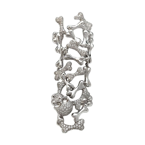 Une bague articulée signée de la créatrice Lauren Rubinski, 'Vanité', en or blanc 750/000 et diamants, recouvrant l'ensemble du doigt. Elle est faite d'une imbrication d'ossements et d'une tête de mort partiellement rehaussés de diamants taille brillant.