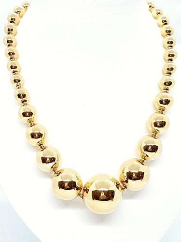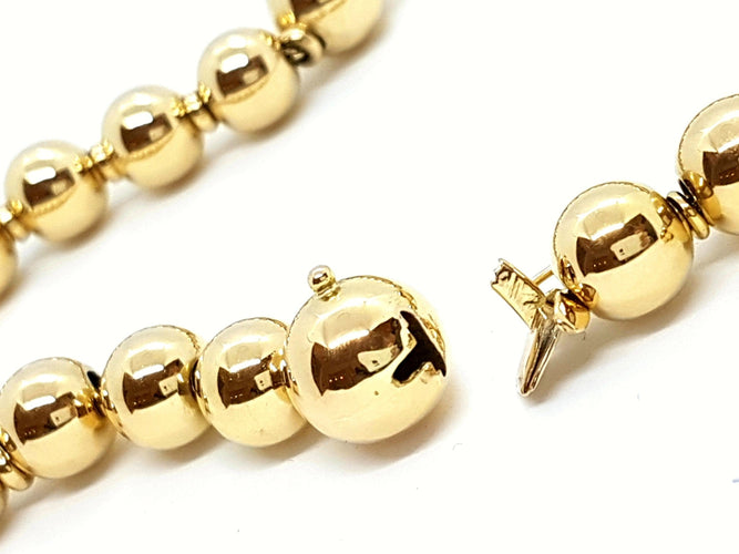 Collier boules en Or jaune 750 millièmes (18 carats), Longueur 50 cm, Diamètre des boules 3 cm pour la plus grande et 1 cm pour les plus petites, poinçonné, excellent état, poids total : 123,43 g