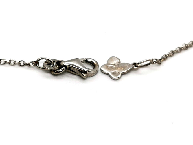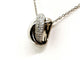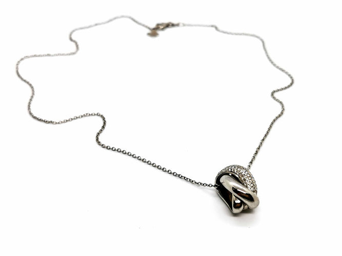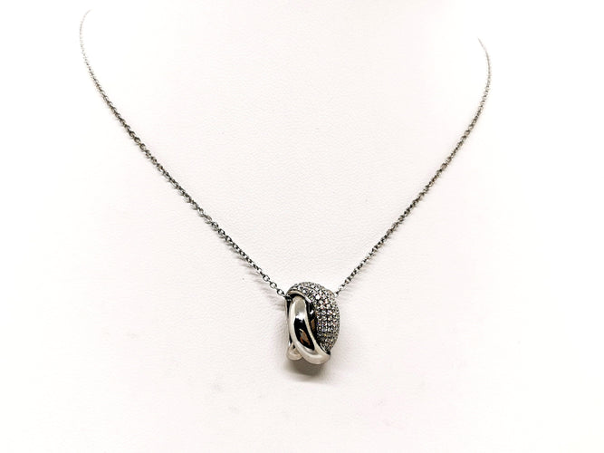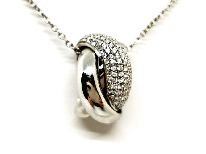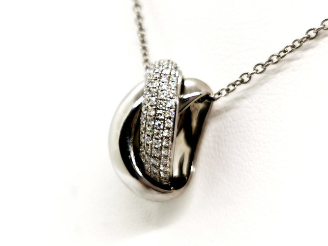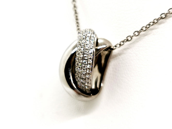 Chaîne et pendentif, en or blanc 750 millièmes (18 carats), signé du joaillier Piero Milano, pendentif entrelacé, pavé de 77 diamants sur 5 rang, taille brillant G/VS, pour un total d'environ 0,53 ct, chaîne maille forçat, longueur chaîne : 42 cm, largeur chaîne : 0,12 cm, dimensions pendentif : 1,68 cm x 0,91 cm, poids total : 6,61 g, poinçonné, excellent état