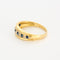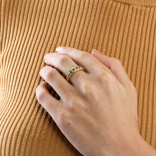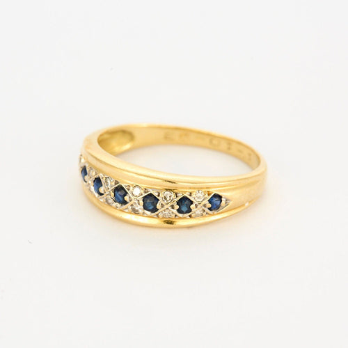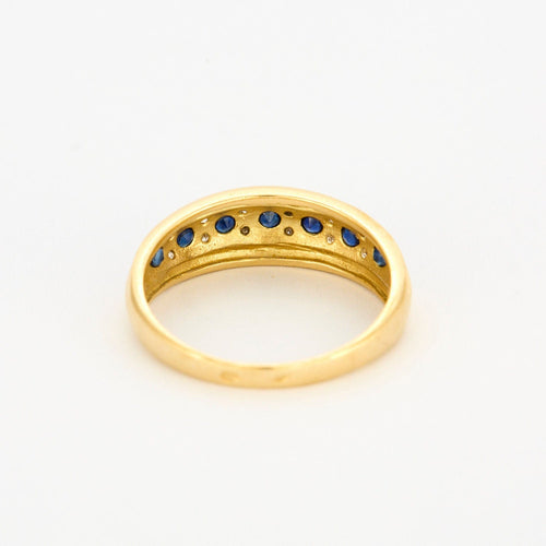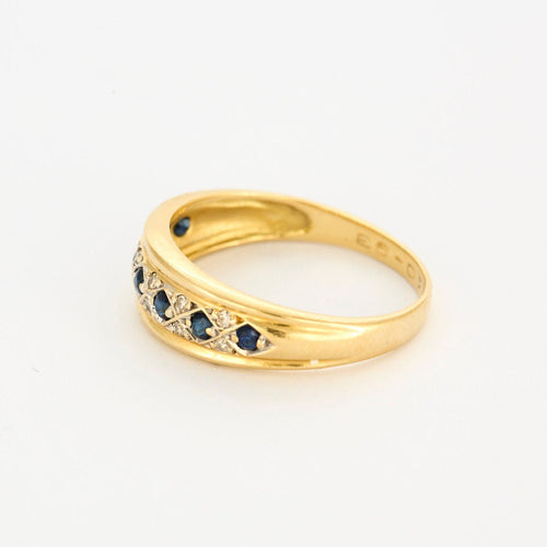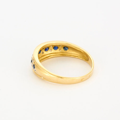 Demie-alliance en or deux tons : or jaune et blanc 18 carats (750/°°°) sertie de saphirs pour 0,08 ct et diamants de taille brillant pour 0,08 ct environ. Poinçon tête d'aigle