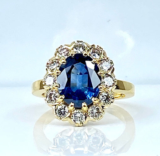 Bague marguerite en or jaune 18 carats ornée d'un saphir de superbe couleur avec une belle transparence poids : 3,50 carats environ, origine probable : Ceylan, entouré de 12 diamants de taille brillant poids:1 carat environ. Monture cossue à panier ajouré. Parfait état.