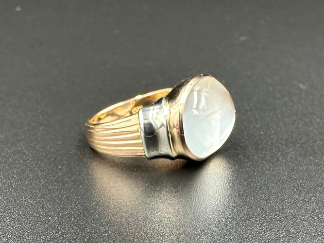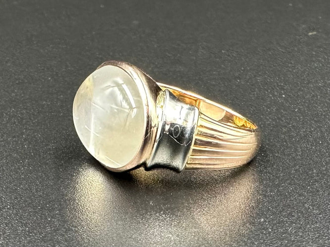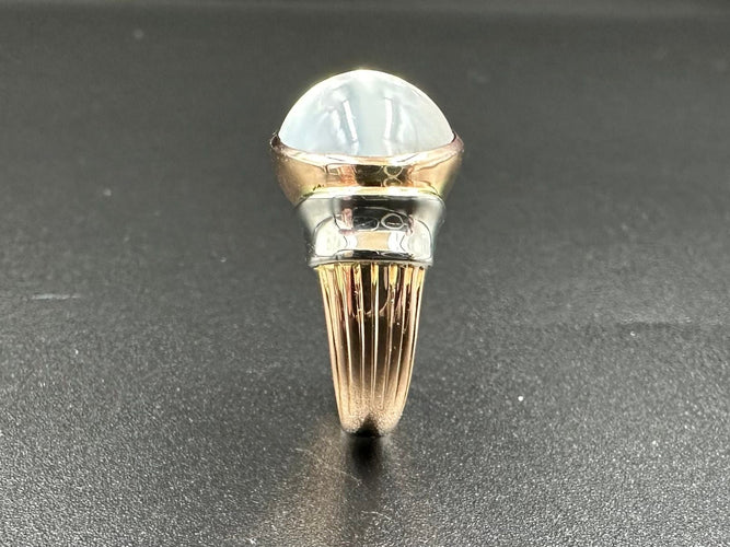 Ravissante bague vintage se composant d’un corps de bague en or rose et blanc 18K orné d’une belle pierre de lune de 8ct environ (11.5 par 15.5mm, pierre repolie, comme neuve !).