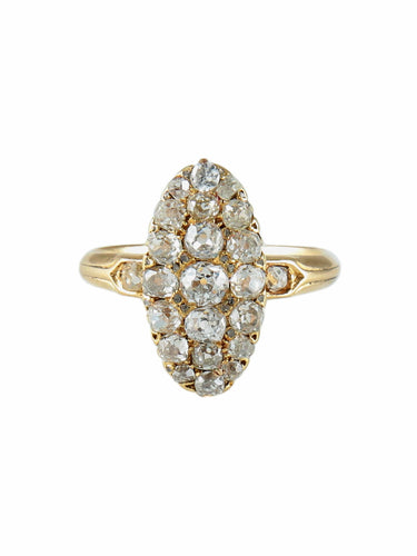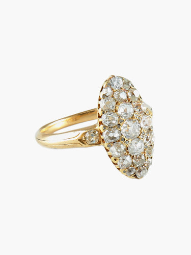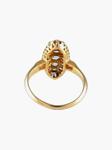 Bague "Marquise" en or jaune 18 carats pavée de diamants taillés en brillant et épaulée de deux diamants.