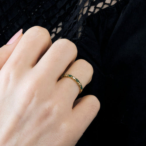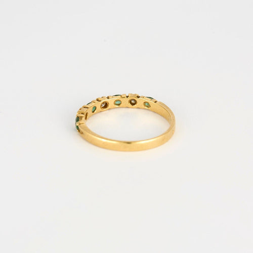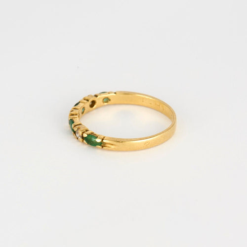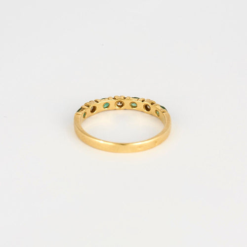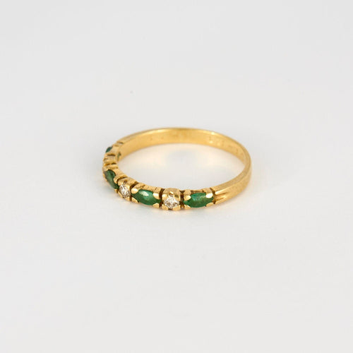 Demie alliance en or jaune 18 carats (750/°°°) sertie alternativement de diamants et d'émeraudes navettes.