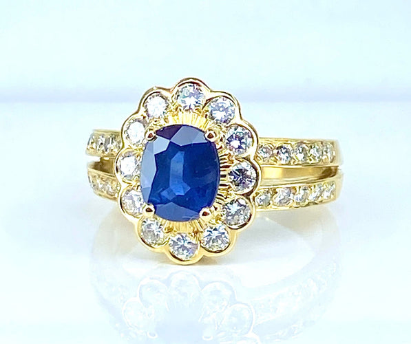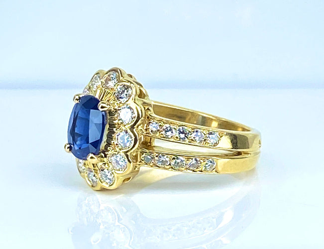Bague marguerite en or jaune 18 carats ornée d'un saphir de très belle couleur bleue poids :1,50 carat environ entouré de 12 diamants de taille brillant poids:0,50 carat environ. La monture cossue est à double anneaux qui sont rehaussés de 20 diamants de taille brillant poids poids: 0,30 carat environ. Parfait état. Travail français, poinçon tête d'aigle .