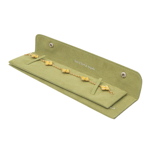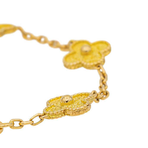 Bracelet signé de la Maison Van Cleef & Arpels en or jaune 750 millièmes (18 carats), modèle Alhambra 5 motifs, longueur : 19 cm, largeur : 1,40 cm, dimensions d'un trèfle: 1,40 x 1,40 x 0,52 cm, poids total : 14,70 g, poinçon hibou, vendu avec le pochon d'origine, numéroté : B2490R, excellent état