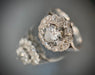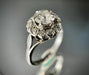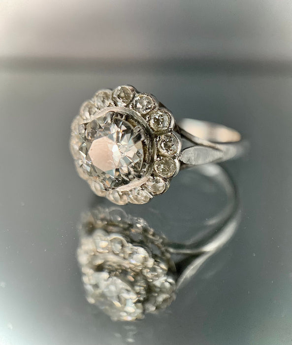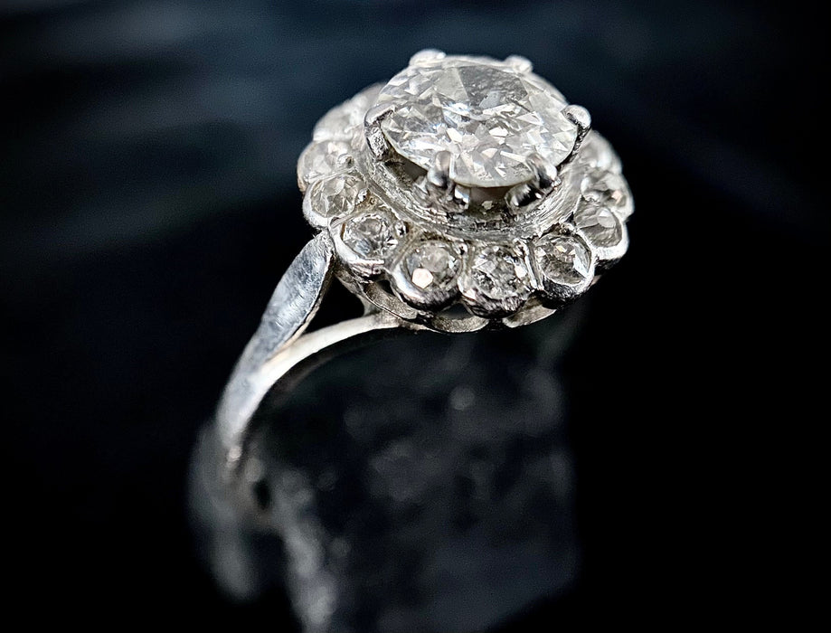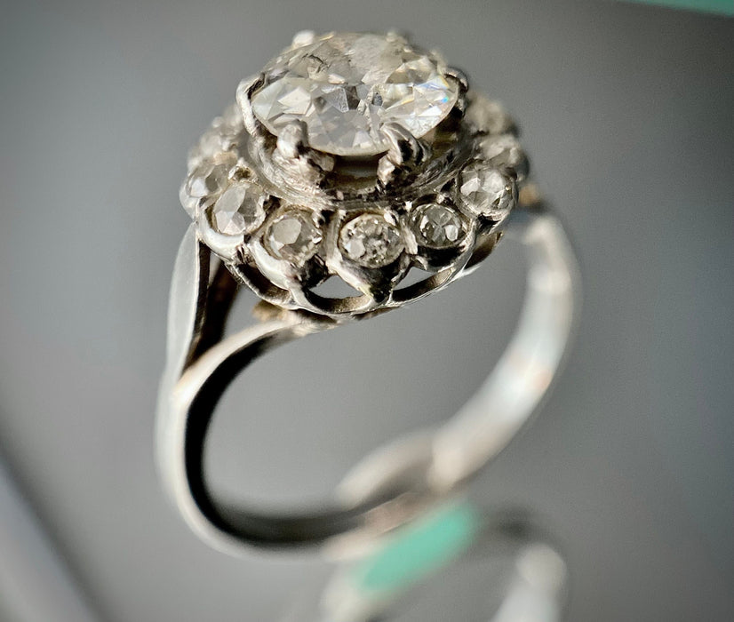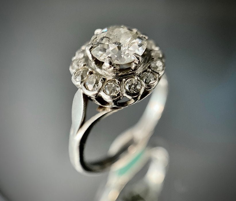 Bague en or 18 carats sertie d'un diamant taille ancienne de 1,30 carat (P-G/H) entouré de 14 diamants totalisant 0,56 carat.