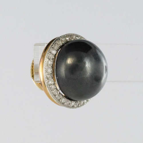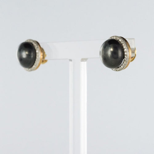 - Superbes puces d'oreilles, elles sont constituées d'un cabochon d'hématite serti au centre d'un entourage de diamants taillés en rose. Le fermoir est un alpa.