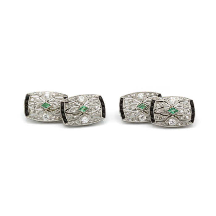 Magnifiques boutons de manchettes de l'époque Art Déco en or blanc 750‰ et platine 950‰. Au centre de chaque motif une émeraude taille losange épaulée de deux diamants taille ancienne et d'un pavage de diamants taille rose, le tout inscrit entre deux lignes d'onyx calibrés.