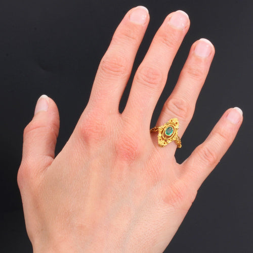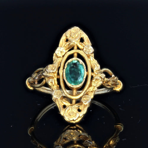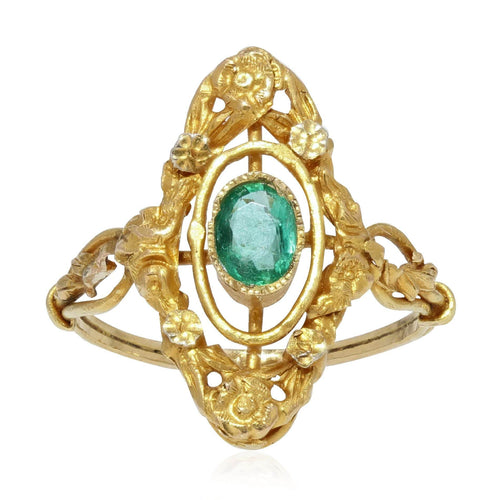 - Elégante bague ancienne, elle présente une monture allongée, sertie clos millegrains au centre d'une émeraude. L'ensemble du plateau est ciselé de décors floraux qui se poursuivent sur le départ de l'anneau.