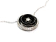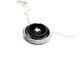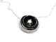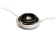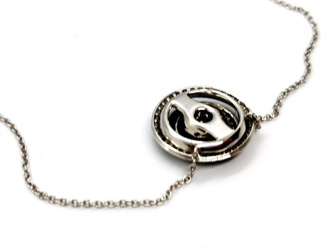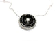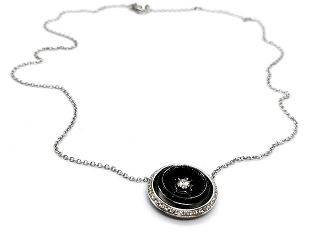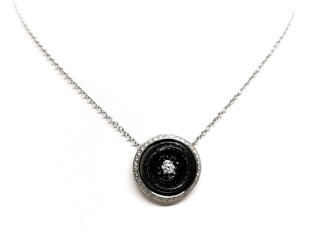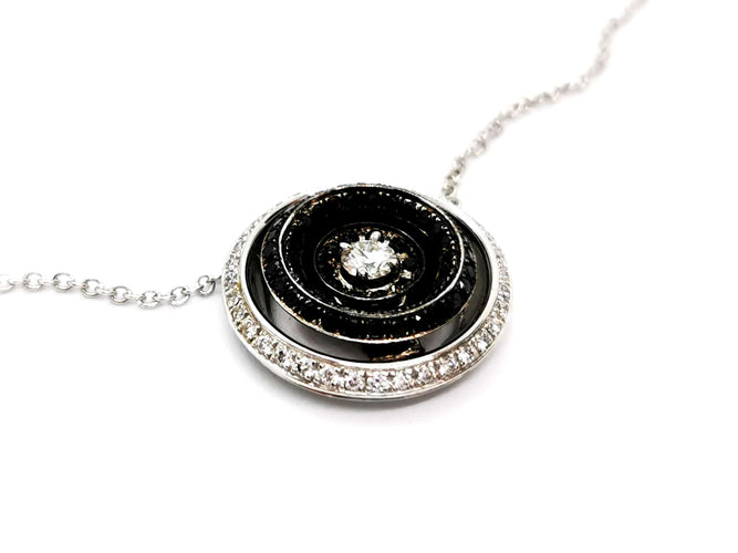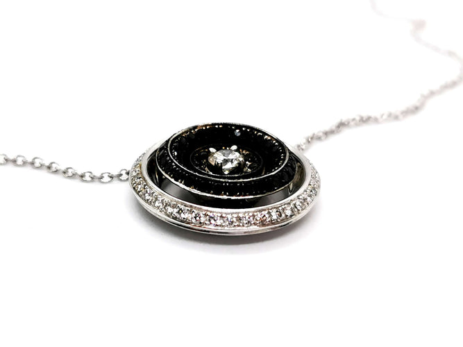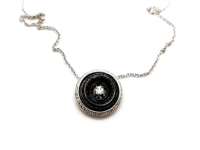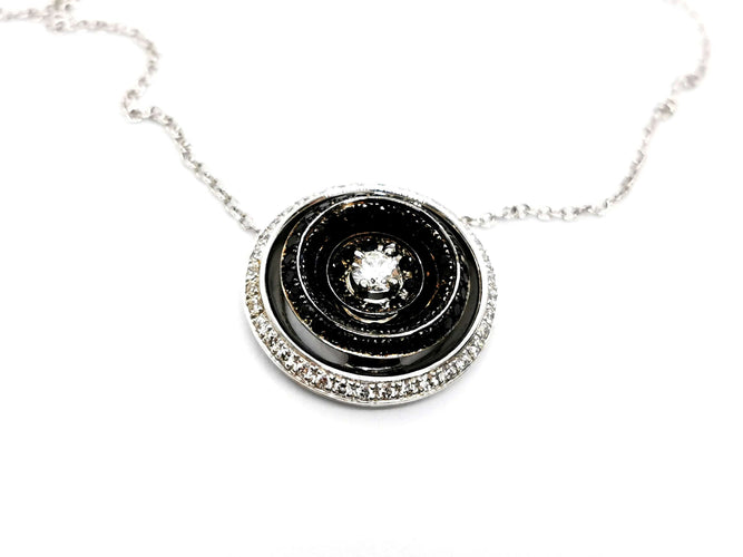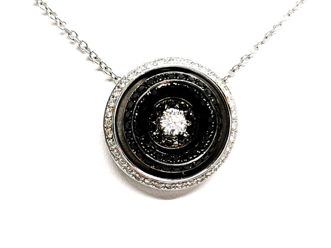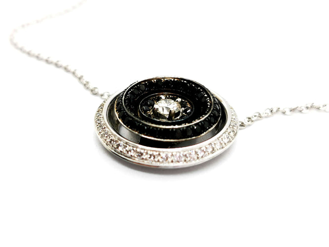 Collier en or blanc 750 millièmes (18 carats), pendentif rond, serti au centre d'un diamant blanc, taille brillant G/VS d'environ 0,18 ct, entouré de 62 diamants noir taille brillant, pour un total d'environ 0,37 ct, et de 37 diamants blanc taille brillant G/VS pour un total d'environ 0,22 ct, poids total diamants : environ 0,77 ct, longueur : 43 cm avec anneau intermédiaire à 41cm, largeur chaîne : 0,14 cm, diamètre pendentif : 2 cm, poids total : 9,97 g, poinçonné, excellent état
