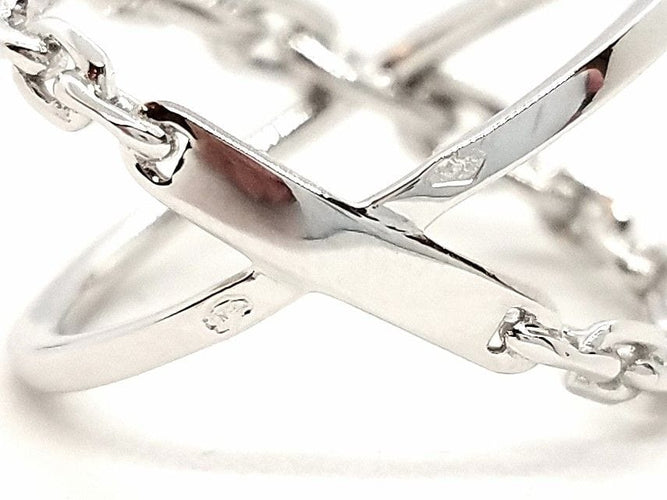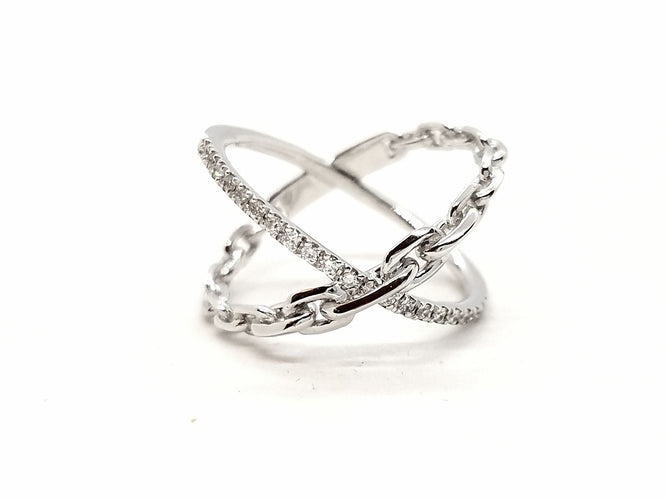 Bague en or blanc 750 millièmes (18 carats), composé de lignes croisées, une formée maillons et l'autre pavées de 23 diamants taille brillant F-VS pour 0,23 ct au total, tour de doigt: 53, largeur sur le coté: 1,3 cm, largeur de la ligne de diamants: 0,14 cm, largeur des maillons: entre 0,33 cm et 0,25 cm, poinçon tête d'aigle, poids total: 3,46 g, état neuf