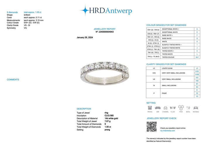 Pierre: Diamants d'un poids total de 1,00 carat, Chaque diamant a été certifié par le HRD (Hoge Raad voor Diamant), ce qui garantit sa qualité exceptionnelle et son authenticité