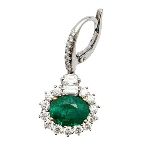 Une paire de boucles d'oreilles en or blanc 750/000 chacune sertie d'une émeraude (Brésil, Huile modérée) entourée de diamants taille brillant.