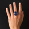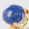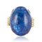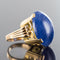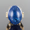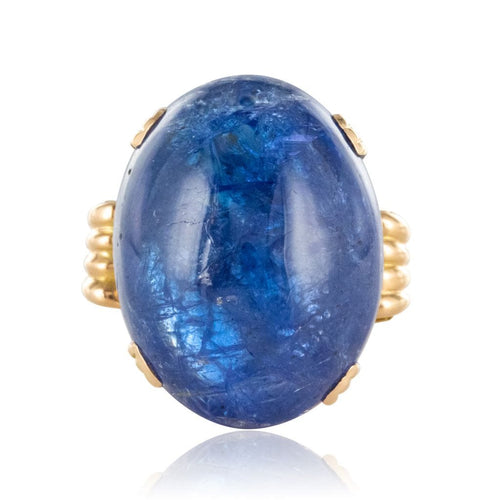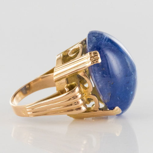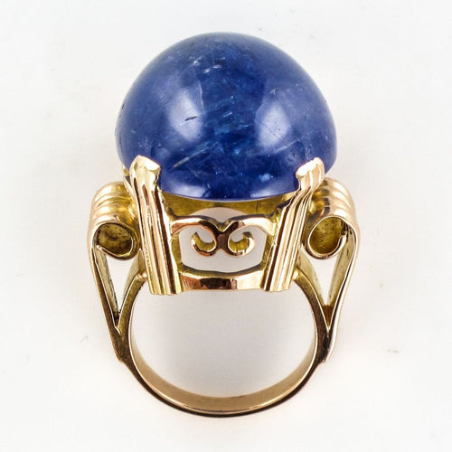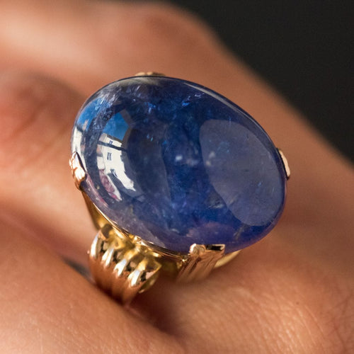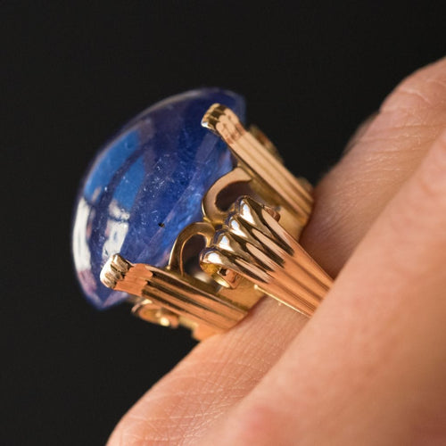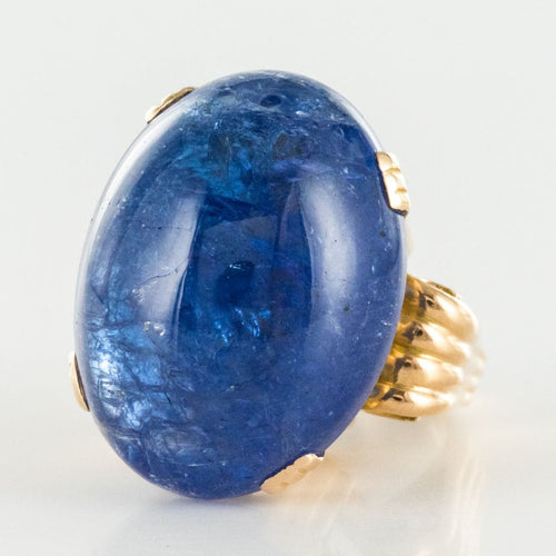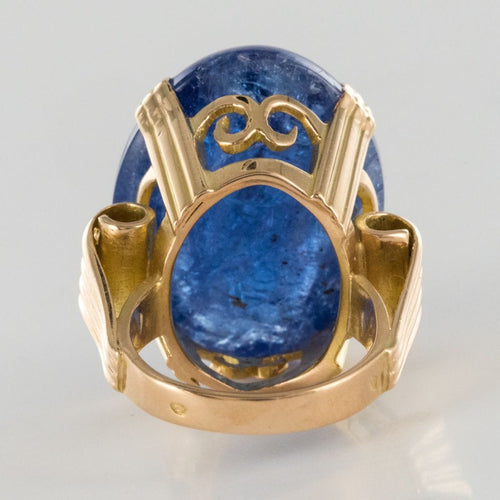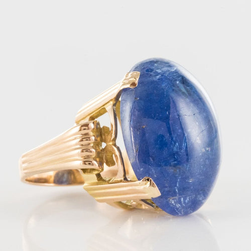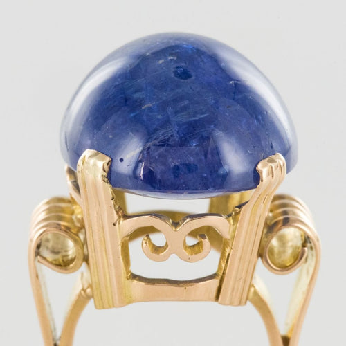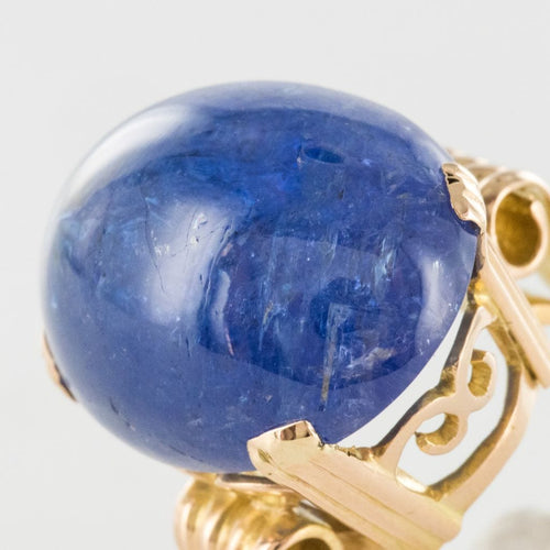 Bague en or jaune 18 carats, 750 millièmes, poinçon tête d'aigle. Cette bague vintage spectaculaire est ornée sur son dessus d'un cabochon de tanzanite retenu par 4 longues griffes composées chacune de 3 fils d'or, qui viennent jusqu'à la base de la corbeille entièrement ajourée de volutes. De part et d'autre, le départ de l'anneau forme un enroulement.