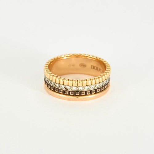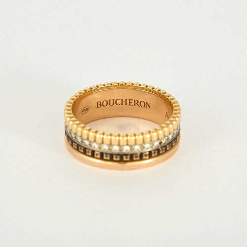 Bague en or rose, jaune et blanc 18K (750 millièmes) composée de quatre joncs ciselés à motif grograin, clous de Paris en PVD marron, et lisse dont un est pavé de 33 diamants ronds taillés en brillant, calibrant un total d'environ 0,25 carat. Signée "BOUCHERON" et numérotée. Avec poinçon de maître de la Maison et poinçon de titrage suisse (Saint-Bernard).