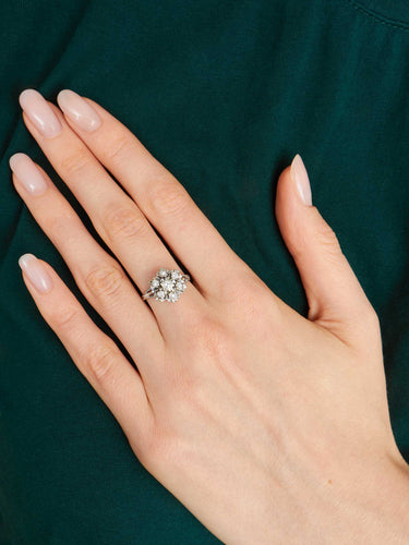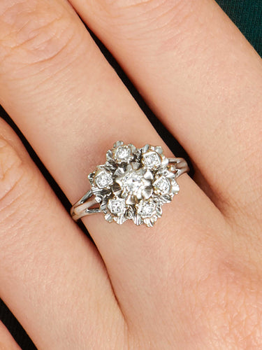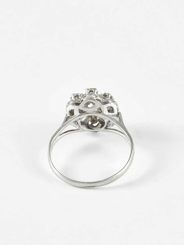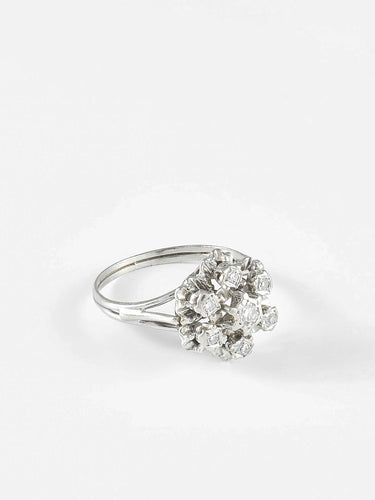 Bague ancienne en or gris 750 millièmes sertie de 7 diamants . La bague peut faire penser à une forme de fleurs ou bien d’étoile à 6 branches.