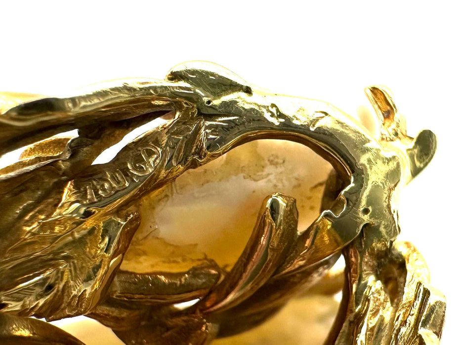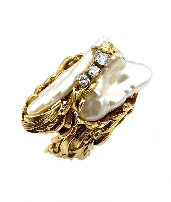 Très importante bague réalisée par Gilbert Albert en or jaune 18K rehaussée de deux importantes perles Keshi et de 3 diamants (0.20ct environ H/VS).