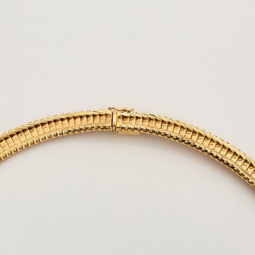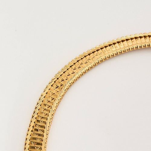 Collier souple en or jaune 18 carats (750/°°°) amati, à décor floral strié.
