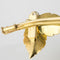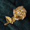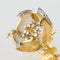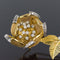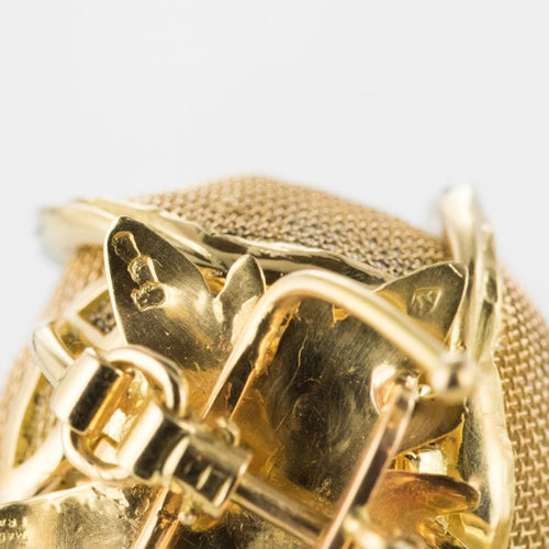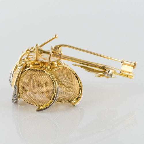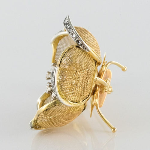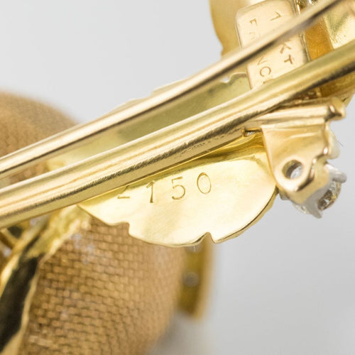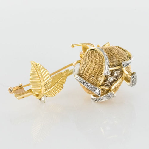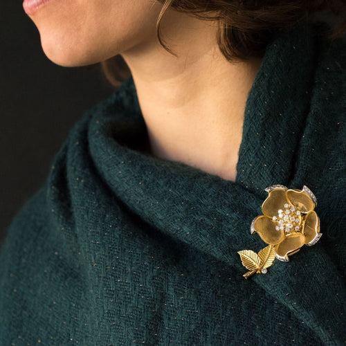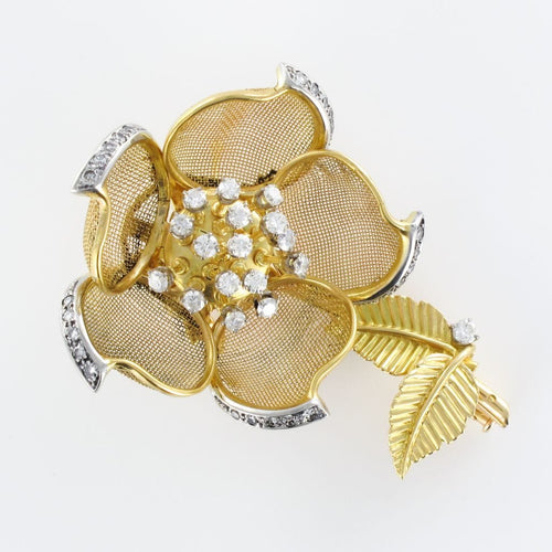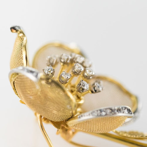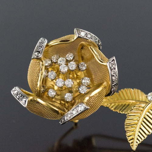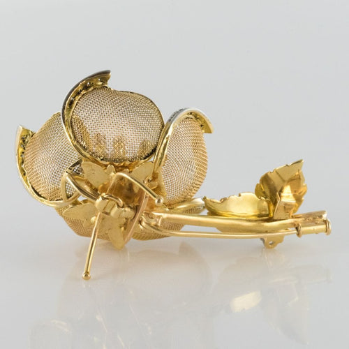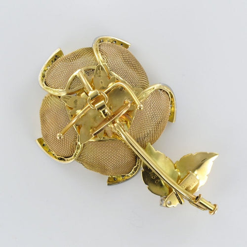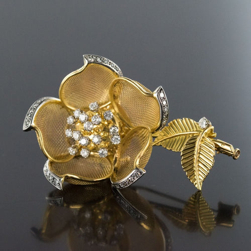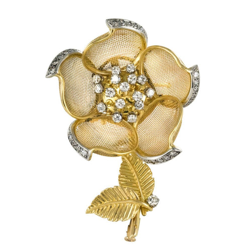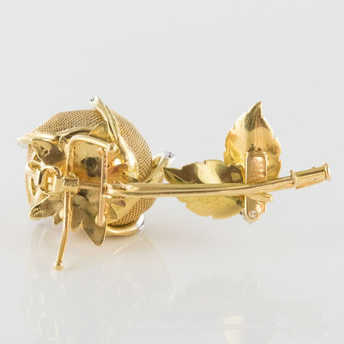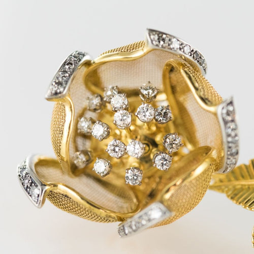 Broche en or jaune, 750 millièmes, 18 carats, poinçon tête de mercure et platine, tête de jeune fille. Représentant une rose, cette broche vintage est articulée et peut ainsi présenter la fleur ouverte ou fermée en bouton. Les pistils sont formés de tiges d'or mobiles serties chacune à leur extrémité d'un diamant taille brillant. Les pétales sont réalisés en fils d'or tissés et le bord du pétale serti d'une ligne de diamants. La tige est sertie des feuilles et d'un diamant. Ce sont ces dernières qui activent le mécanisme d'ouverture et fermeture de la fleur par un mouvement du bas vers le haut et inversement. L' épingle présente une pompe de sécurité et 2 tiges en or se trouvent à l'arrière de la fleur afin de la maintenir bien en place une fois fixée au vêtement.