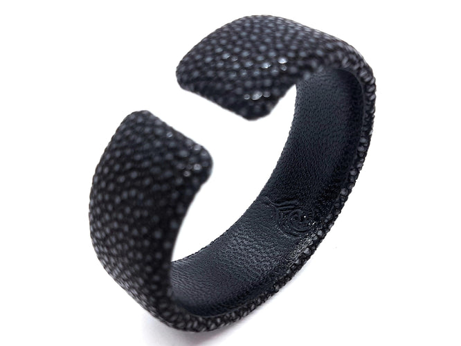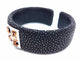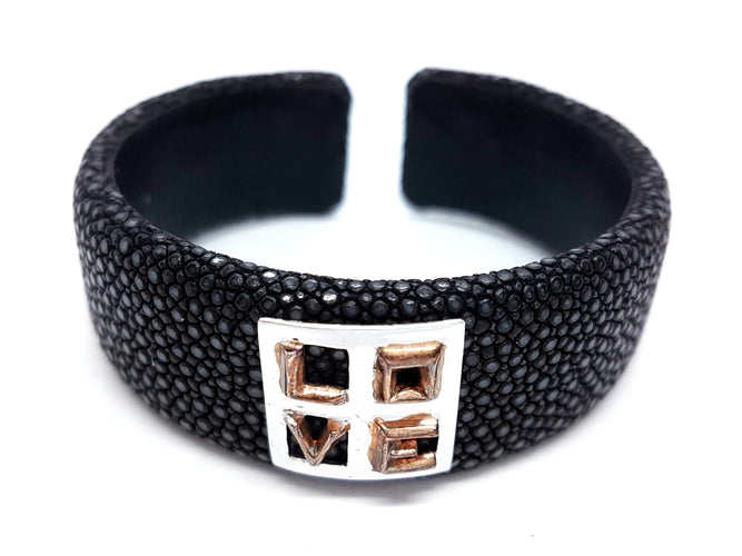 Bracelet manchette en galuchat noir, et orné au centre d'un motif "Love" en or blanc et rose 18 carats.