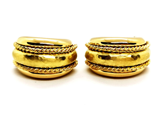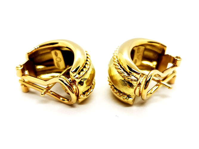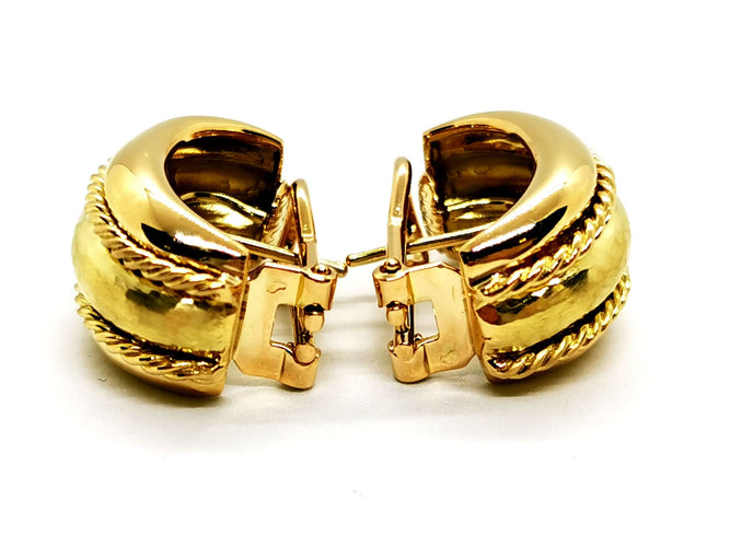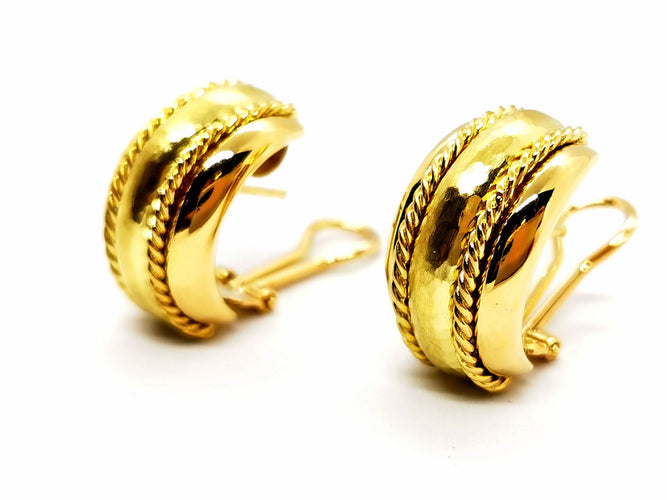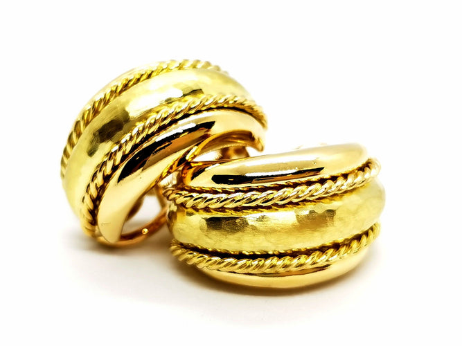 Boucles d'oreilles en or jaune 750 millièmes (18 carats), tige et clip, or mat et brillant, dimensions : 2,27 cm x 1,35 cm, poids total : 16,96 g, poinçon tête d'aigle, excellent état
