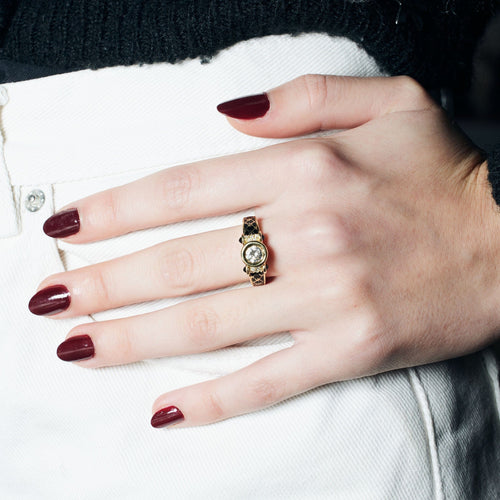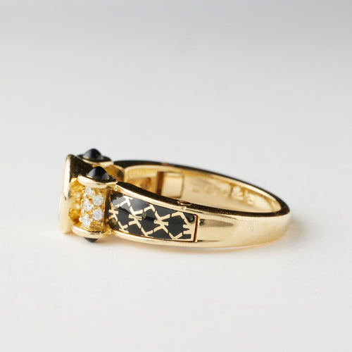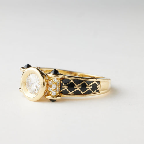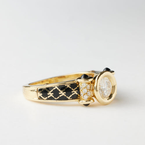 Bague signée de la maison korloff sertie d'un diamant au centre et entouré de petit pavage de diamants en émail noir et or jaune 18k