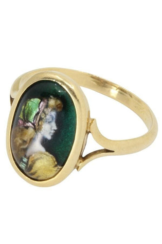Cette bague ancienne est sertie d’un émail de Limoges représentant le profil droit d’une femme, elle est signée L.Clément, un peintre et maître émailleur français.
