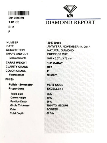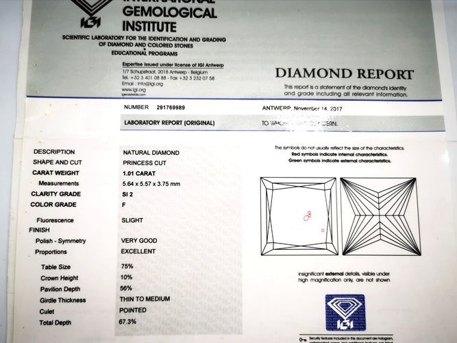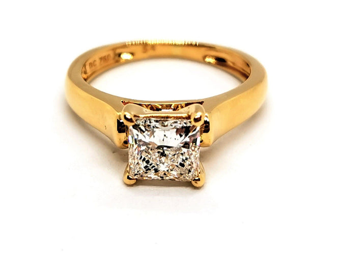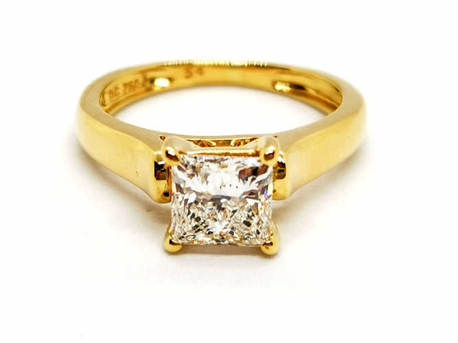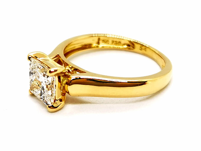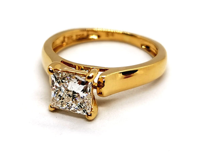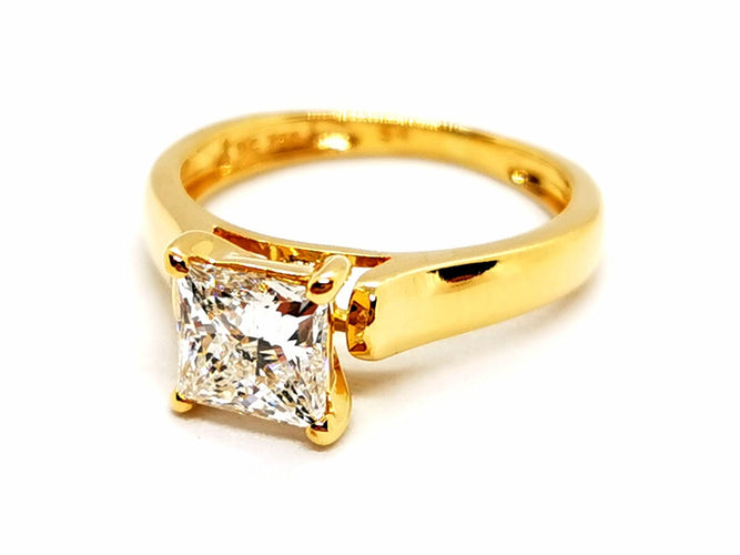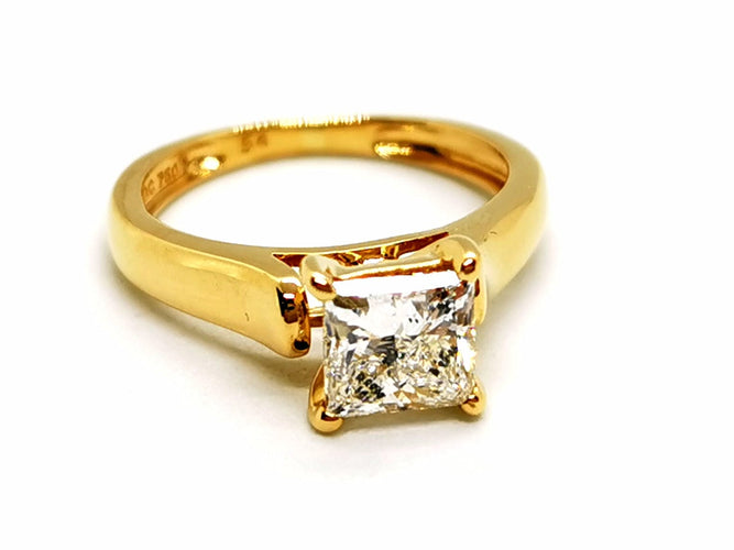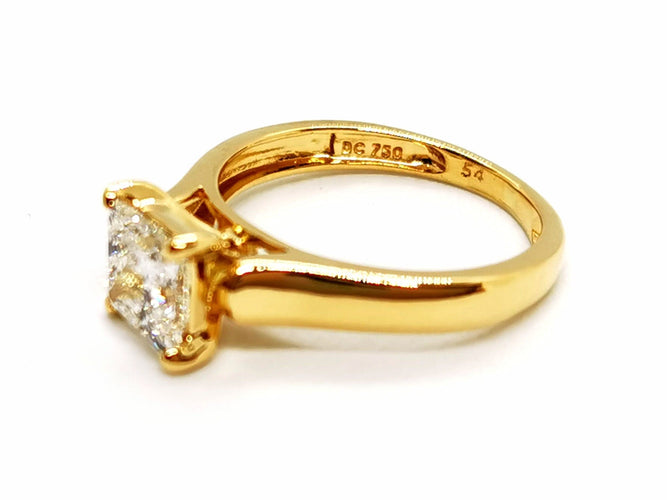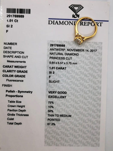 Bague solitaire, en or jaune 750 millièmes (18 carats) testé, sertie d'un diamant, taille princesse F/SI2, de 1,01 carat, serti 4 griffes, certifié IGI N°: 291769989.