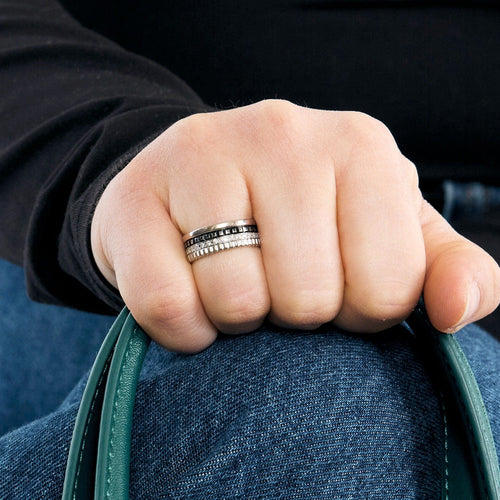 Bague en or gris 18K (750 millièmes) composée de quatre godrons ciselés à motif grosgrain, clou de Paris et lisse alternés par une ligne en PVD noir.