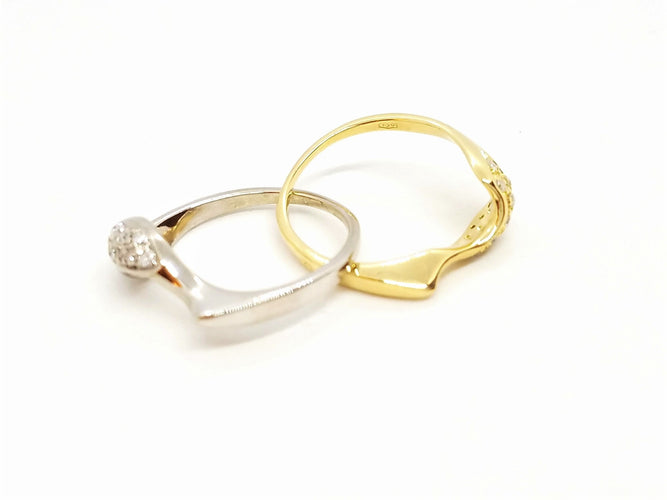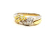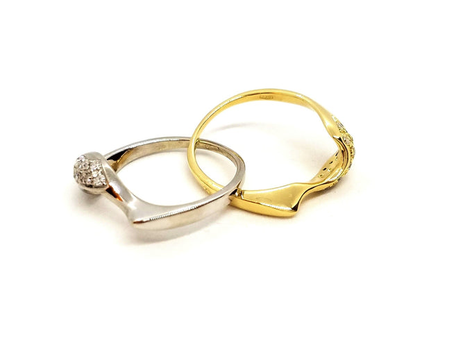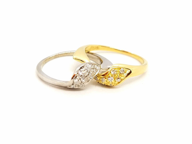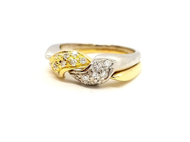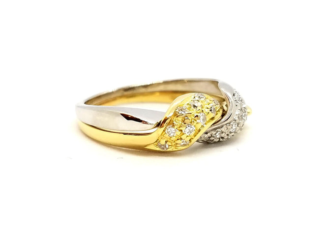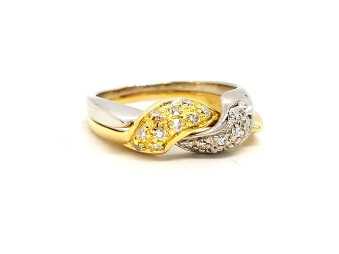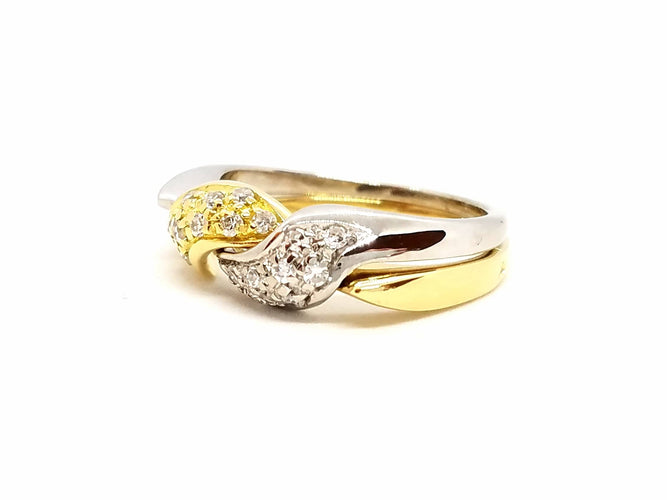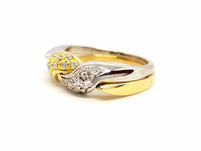 Bague bicolore, en or 750 millièmes (18 carats), deux anneaux mobiles entrelacés, l'un en or blanc et l'autre en or jaune, pavée de 20 diamants taille brillant H-SI pour environ 0,20 ct au total, tour de doigt : 52, largeur sur le dessus : 0,62 cm, poids total : 5,85 g, poinçonné, excellent état