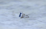 Bague de fiançailles en or blanc (poinçon : tête d'aigle ), dont le centre est orné d'un saphir synthétique ovale, dans un entourage de saphirs synthétiques triangulaires et de diamants taillés en rose.
