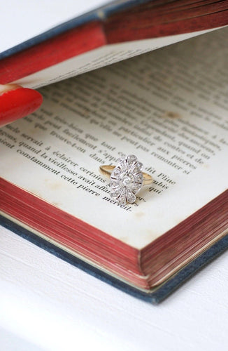 . Bague Art Déco de fiançailles, marquise, en or jaune 18kt et platine (poinçon tête d'aigle), sertie en son centre d'un diamant taille ancienne pesant environ 0,10Ct, dans un entourage de diamants taillés en rose.