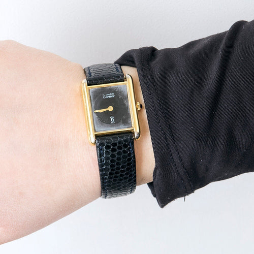 CARTIER - Tank Must - Montre en vermeil (Argent 925 millièmes, plaqué or 18K, 750 millièmes). Couronne de remontoir ornée d'un spinelle bleue. Cadran noir muet, signé Must de Cartier et orné du monogramme de la Maison. Fond à vis. Signé Cartier et numéroté.