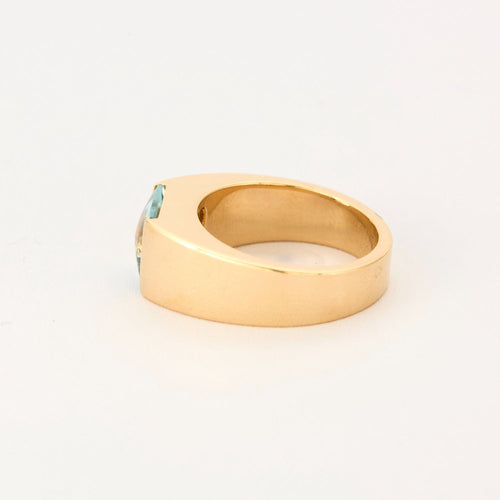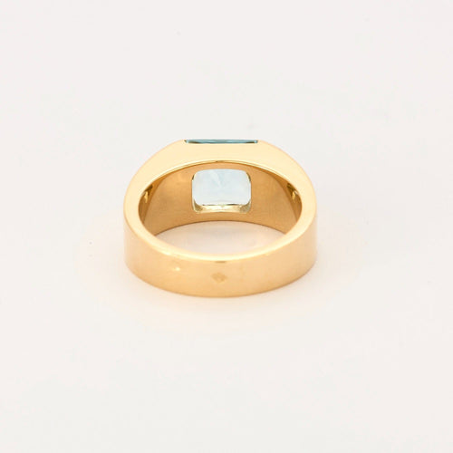 CARTIER - Bague Tank en or jaune 18K (750 millièmes) ornée d'une aigue-marine suiffée (cabochon sur sa partie haute, facettée sur sa partie basse). Signée et numérotée.