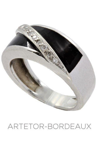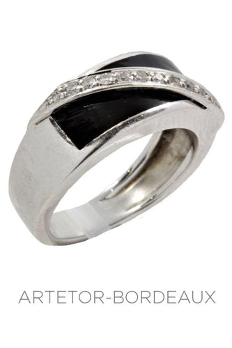 Cette bague moderne est sertie d'un onyx et de diamants taille moderne.