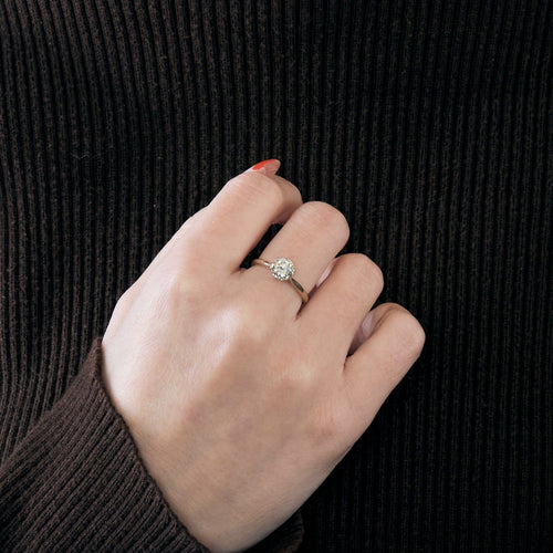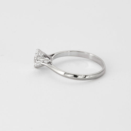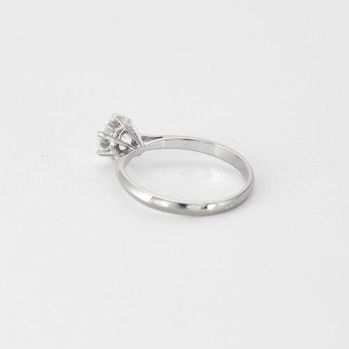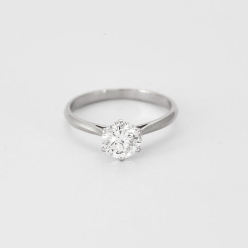 Bague solitaire en or blanc ornée d'un diamant rond taille brillant calibrant 1,04 carat, serti six griffes sur une monture cathédrale.