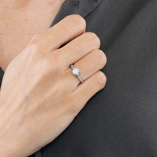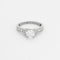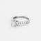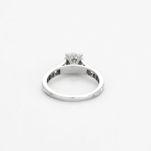 Bague solitaire en platine (950 millièmes) serti d'un diamant de taille brillant calibrant 0,74 carat et épaulé de plus petits diamants en chute.
